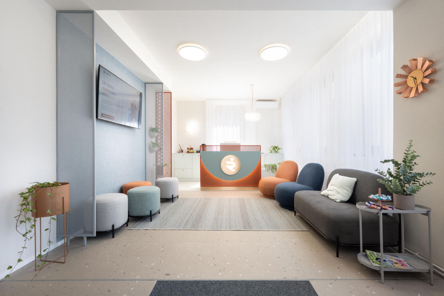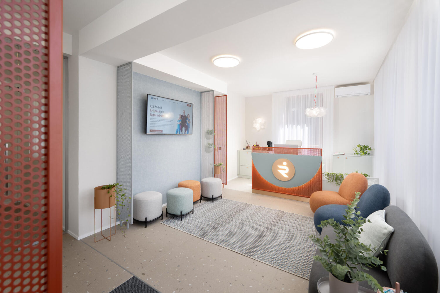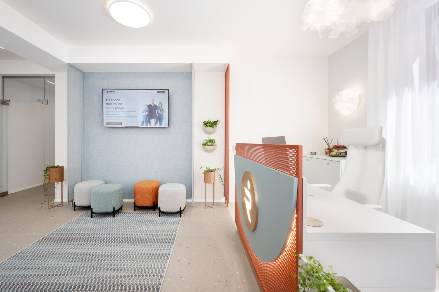 Reco Medical Clinic – to je nová fyzioterapeutická klinika v Brně. Mým přáním bylo vytvořit přátelský a vzdušný interiér, který podpoří proces uzdravování a kde se budou pacienti cítit příjemně. Interiér charakterizuje barevnost, dírkované detaily a měkkost textilu.