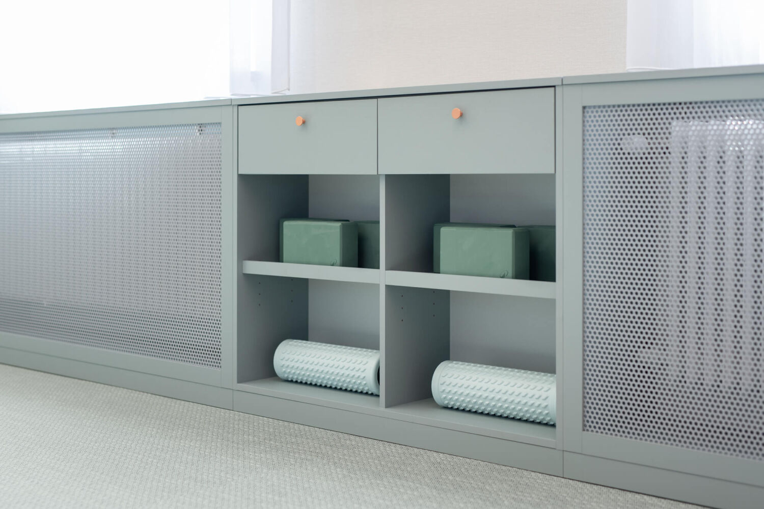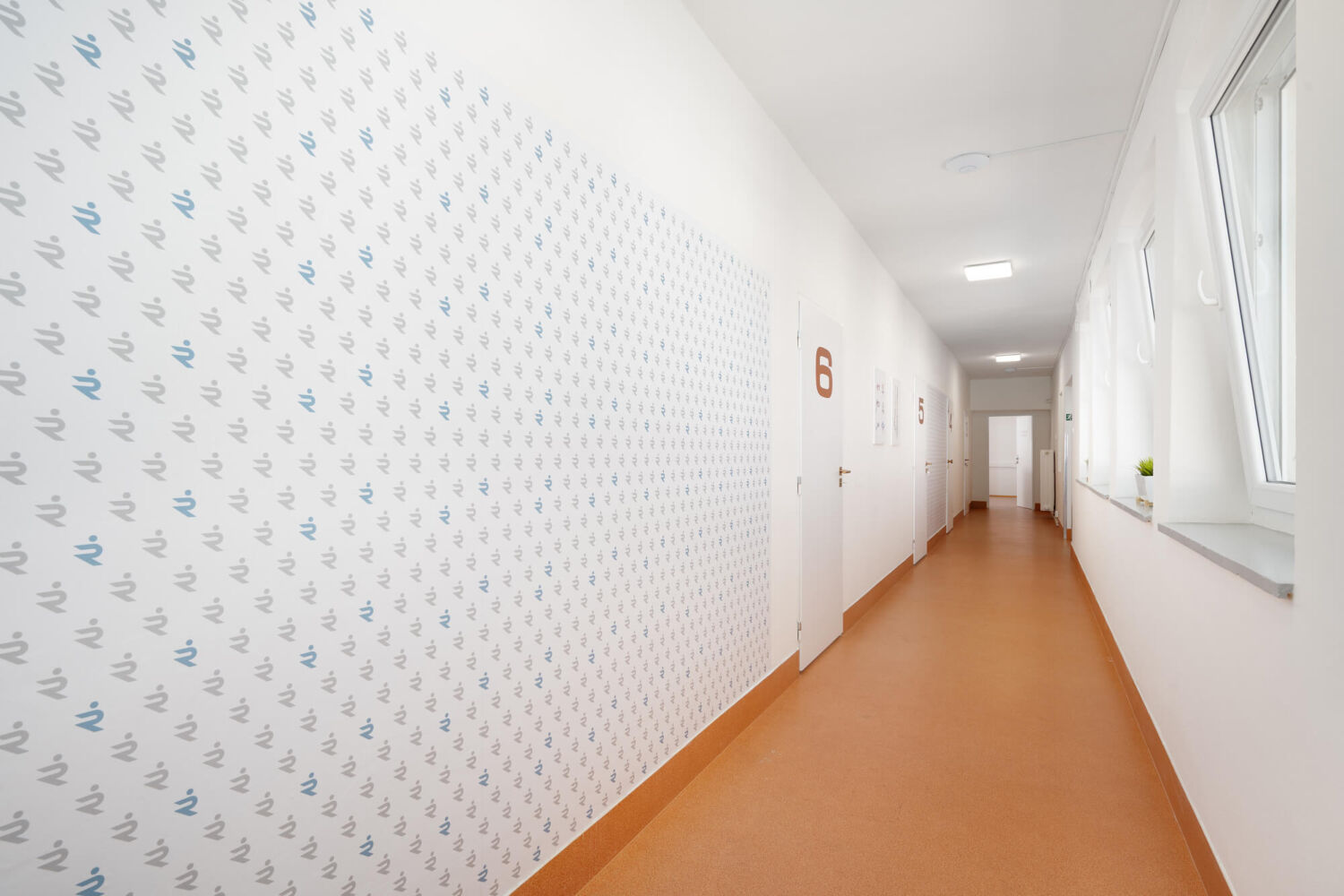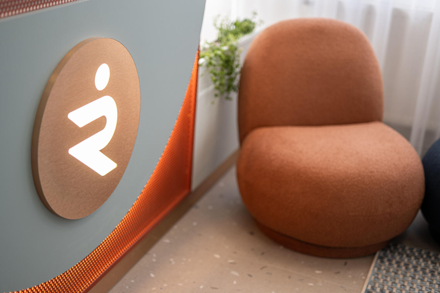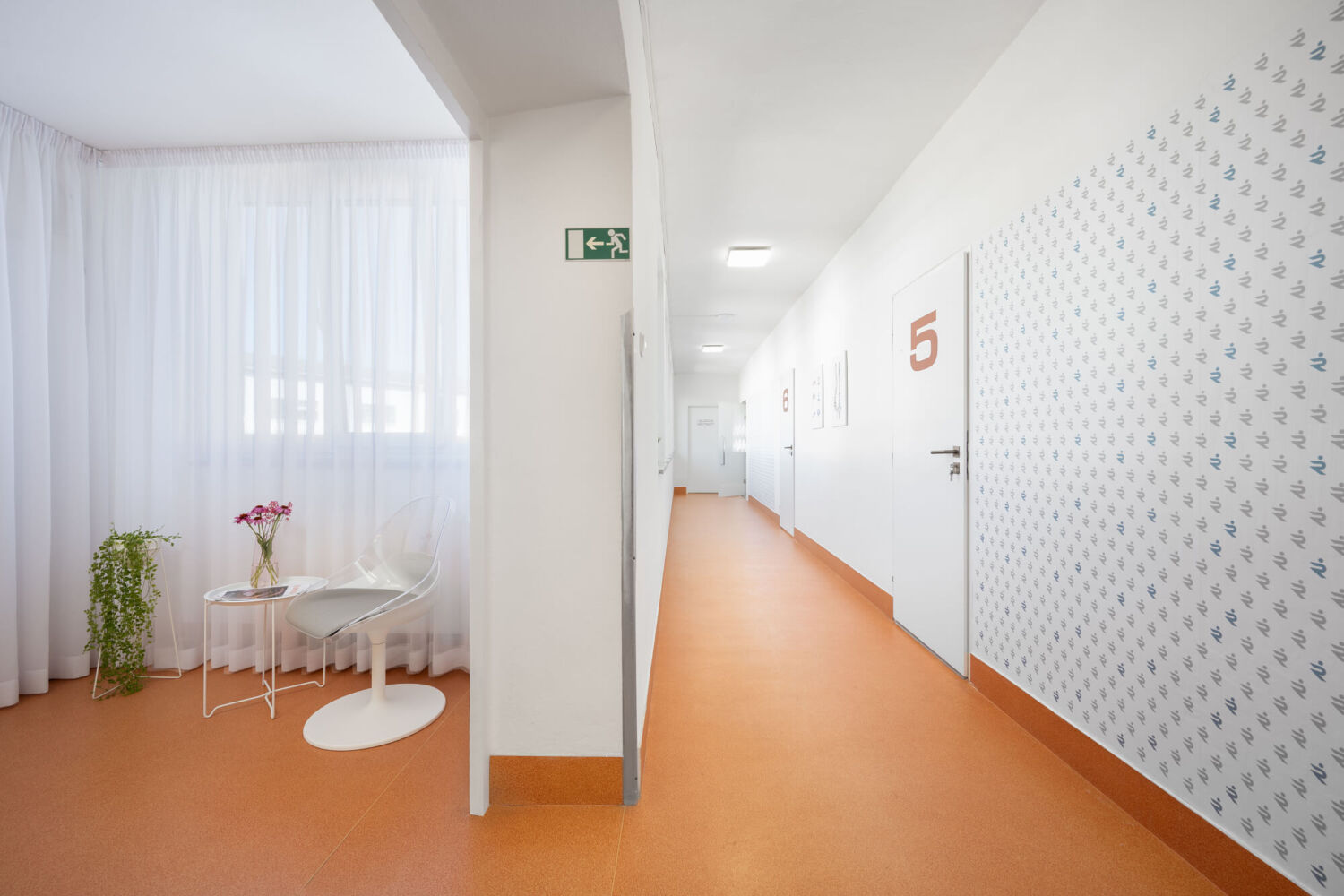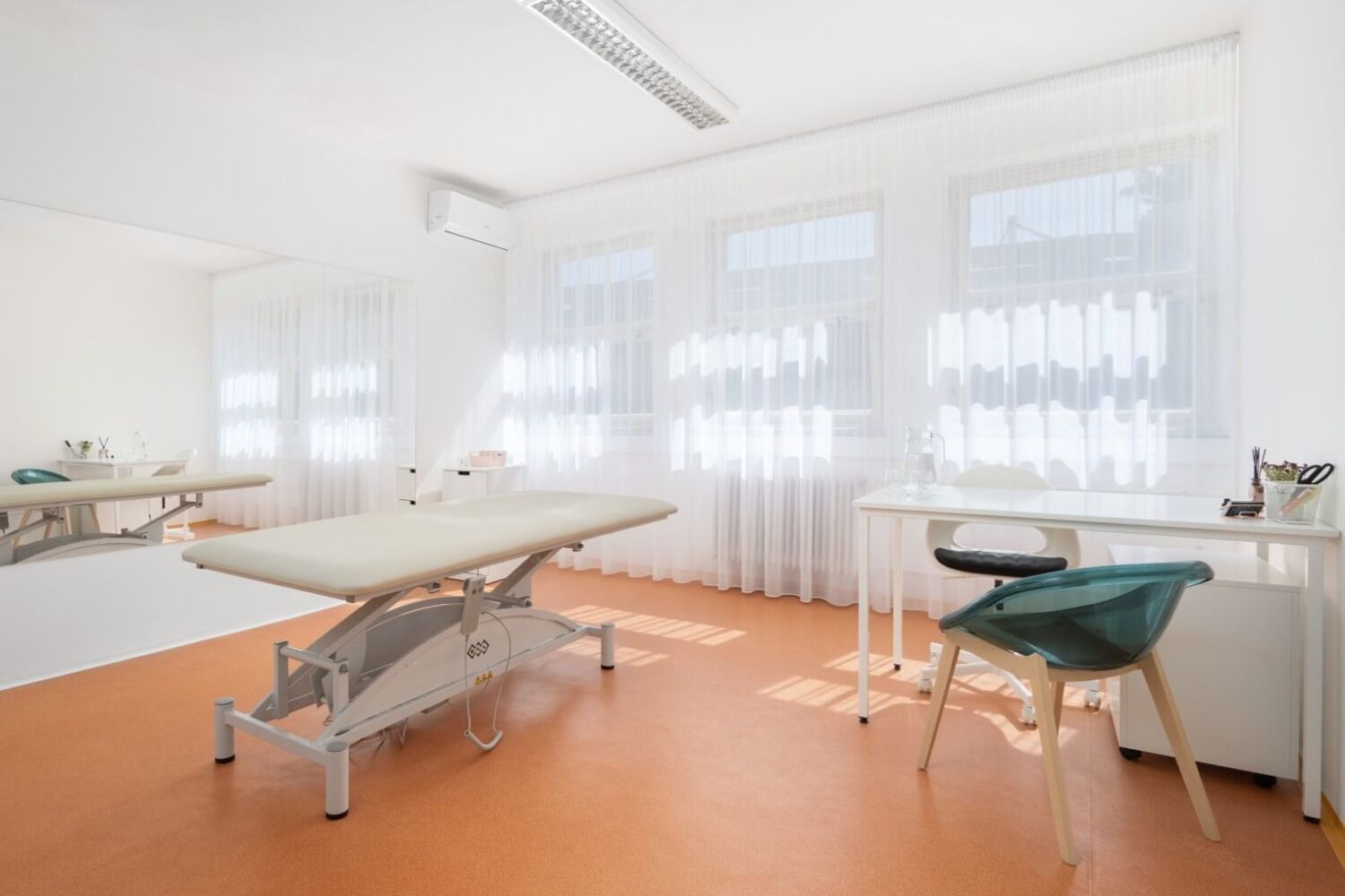 Jednalo se o rekonstrukci, kde bylo v původním prostoru potřeba zachovat některé podlahy ve společných prostorách chodeb a schodiště. Navazovala jsem tedy na tyto detaily a zcela novou podobu dostala recepce a tělocvična. Společným prvkem všech prostor je měděný odstín, který hezky propojuje barevnost původních prostor s novým vybavením. Recepce má originální recepční pult, který kombinuje lehkost děrovaného plechu s odlesky měděného kovolaminátu a díky nasvícení vytváří hezké světelné efekty. Lehkost prostoru dodávají dělící příčky, které jsou také z lakovaných plechů. Sedací nábytek je veselý a hravý, vzhledem k tomu, že klinika nabízí také fyzioterapii pro děti, mají i ony místo k sezení na barevných taburetkách. Pohodlná čalouněná křesílka a malá pohovka evokují spíše příjemný obývací pokoj, než zdravotnické zařízení, aby se zde pacienti cítili uvolněně. Měkkost a příjemnou atmosféru dotváří všem prostorám záclony, které zároveň kryjí původní okna.